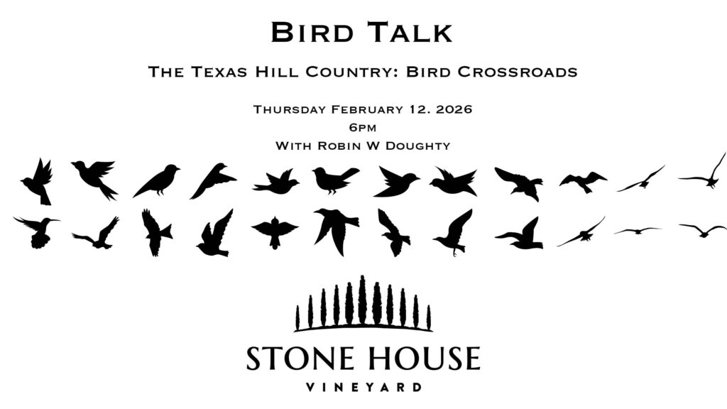 Master Class – Bird Talk 6:00 pm – 7:00 pmFebruary 12, 2026 Stone House Vineyard24350 Haynie Flat RoadSpicewood, TX 78669(512) 264-3630View LocationMap Stone House Vineyard $50 per person – includes wine & light appetizers Buy Tickets iCal Google Calendar View full calendar